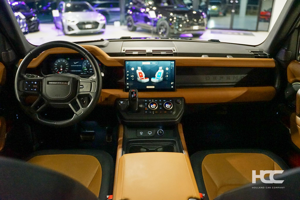 Deze specifieke Defender is uitgevoerd in de kleur Shifting Pangea met af-fabriek satijne PPF (Paint Protection Film) en cognac lederen bekleding.